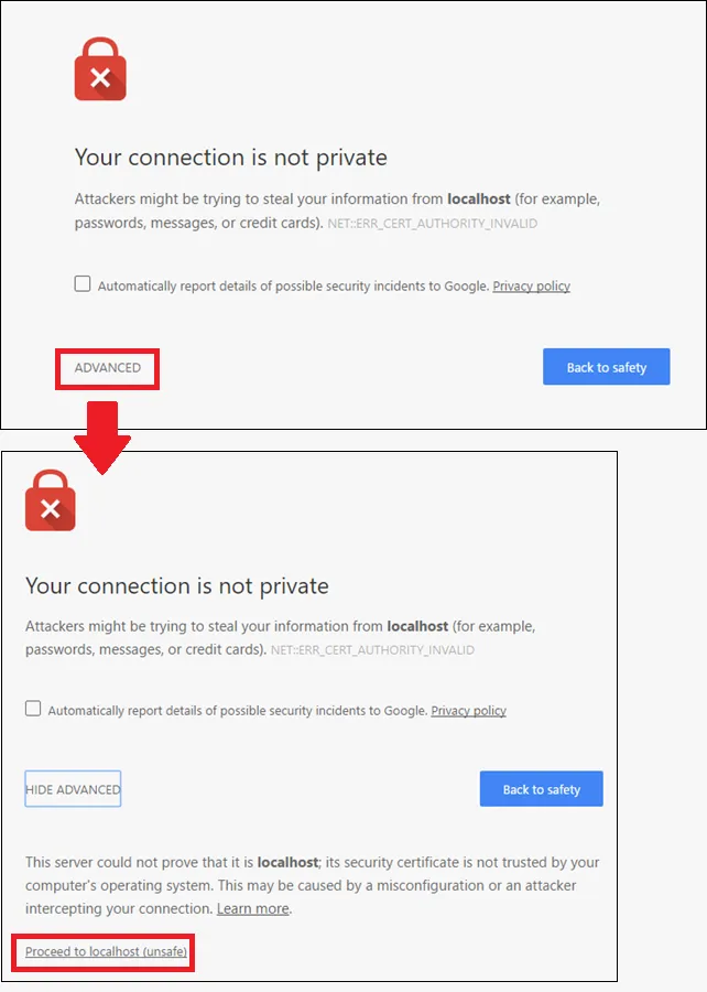 The first time you navigate to the URL you’ll get a warning because the certificate is self-signed. You can however nagivate past this warning to the app’s home page: