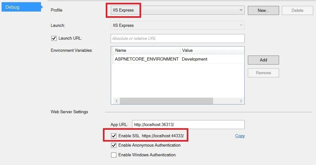 Setting HTTPS up on our development version is simple. Just open the project properties, go to the Debug section, make sure you are running under IIS Express and tick Enable SSL.