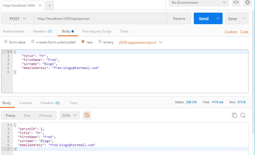 // returned the saved person to the client return Json(person);}So, let’s test our API in Postman.