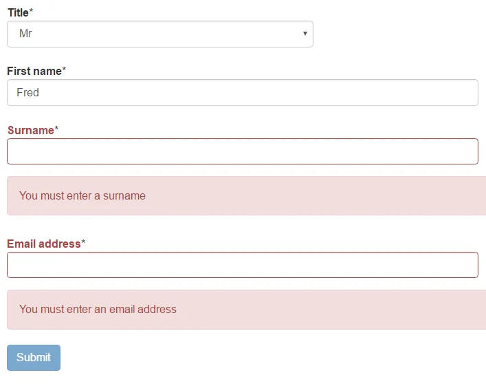In our example, we don’t have any validation that is not bound to a single field (cross field validation), but if we did, the validation errors would be shown at the top of the page.