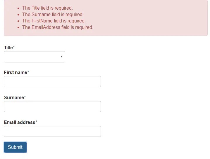 public class Person{ public int PersonId { get; set; } [Required] public string Title { get; set; } [Required] public string FirstName { get; set; } [Required] public string Surname { get; set; } [Required] public string EmailAddress { get; set; }}Here’s our controller below.