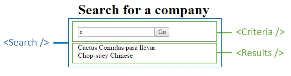 var Search = React.createClass({ render: function () { return ( <div> <Criteria /> <Results /> </div> ) } });