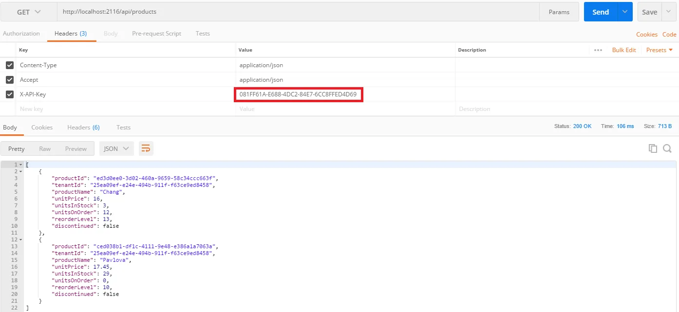 [HttpGet] public IActionResult GetAll() { return Ok(dataContext.Products.ToList()); }}Let’s check this is working in Postman with our 2 API keys. We should get 3 products for the 1st key and 2 products for the 2nd key: