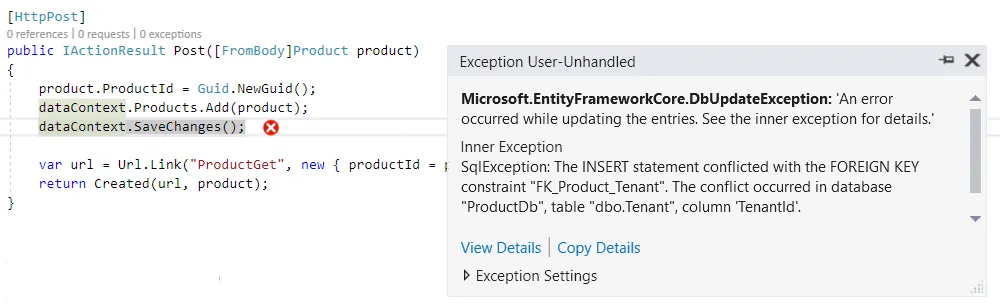 [HttpPost]public IActionResult Post([FromBody]Product product){ product.ProductId = Guid.NewGuid(); product.TenantId = dataContext.GetTenantId(); dataContext.Products.Add(product); dataContext.SaveChanges();