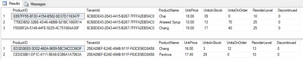 -- connect as tenant 2EXEC sp_set_session_context @key=N'TenantId', @value='25EA09EF-E24E-494B-911F-F63CE9ED8458'GOSELECT * FROM dbo.ProductGOWe should get following results back (3 rows for the first query and 2 for the 2nd query):