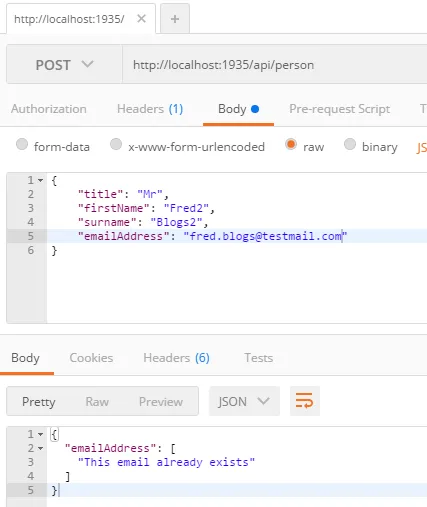 // return validation error if email already exists Person existingPerson = peopleDataContext.People.Where(p => p.EmailAddress == person.EmailAddress).FirstOrDefault(); if (existingPerson != null) { ModelState.AddModelError("emailAddress", "This email already exists"); return BadRequest(ModelState); }