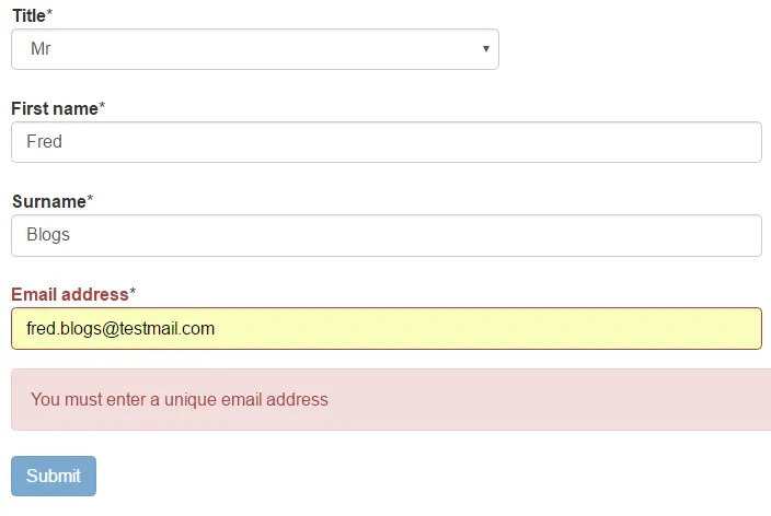 onSubmit() { if (this.personForm.valid) { let headers = new Headers({ 'Content-Type': 'application/json' }); let options = new RequestOptions({ headers: headers }); let person = { title: this.personForm.value.title, firstName: this.personForm.value.firstName, surname: this.personForm.value.surname, emailAddress: this.personForm.value.emailAddress }; this.errors = []; this.http.post('/api/person', JSON.stringify(person), options) .map(res => res.json()) .subscribe( (data) => this.successfulSave = true, (err) => { this.successfulSave = false; if (err.status === 400) { // handle validation error let validationErrorDictionary = JSON.parse(err.text()); for (var fieldName in validationErrorDictionary) { if (validationErrorDictionary.hasOwnProperty(fieldName)) { if (this.personForm.controls[fieldName]) { // integrate into angular's validation if we have field validation this.personForm.controls[fieldName].setErrors({ invalid: true }); } else { // if we have cross field validation then show the validation error at the top of the screen this.errors.push(validationErrorDictionary[fieldName]); } } } } else { this.errors.push("something went wrong!"); } }); }}Now, if we try to input a duplicate email, our user experience is much nicer: