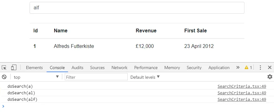 handleCriteriaChange = (e: React.FormEvent<HTMLInputElement>) => { this.setState({ criteria: e.currentTarget.value }, () => { this.props.doSearch(this.state.criteria); console.log(`doSearch(${this.state.criteria})`); });};So, our component invokes the search on every keystroke that the user does: