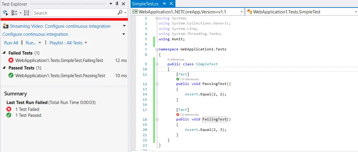 [Fact] public void FailingTest() { Assert.Equal(2, 3); }}If we open up Test Explorer you’ll see our tests and if you run them, 1 should pass and should 1 fail.