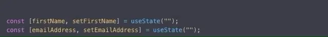 const [firstName, setFirstName] = useState("");const [emailAddress, setEmailAddress] = useState("");If we hover over the variables in VSCode, we see that they are correctly to typed to string and the setter is typed to Dispatch<React.SetStateAction<string>>.